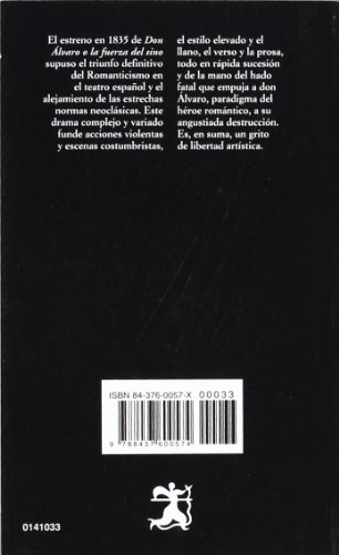 Book by Duque de RivasRang parmi les ventes Amazon: #1505 dans LivresMarque: Brand: CatedraPublié le: 1975-01-01Langue d'origine: EspagnolNombre d'articles: 1Dimensions: 6.90" h x .50" l x 4.30" L, .30 livres Reliure: Broché176 pagesPrésentation de l'éditeurEl estreno en 1835 de " Don Álvaro o la fuerza del sino " supuso el triunfo definitivo del Romanticismo en el teatro español y el alejamiento de las estrechas normas neoclásicas. Este drama complejo y variado funde acciones violentas y escenas costumbristas, el estilo elevado y el llano, el verso y la prosa, todo en rápida sucesión y de la mano del hado fatal que empuja a don Álvaro, paradigma del héroe romántico, a su angustiada destrucción. Es, en suma, un grito de libertad artística.